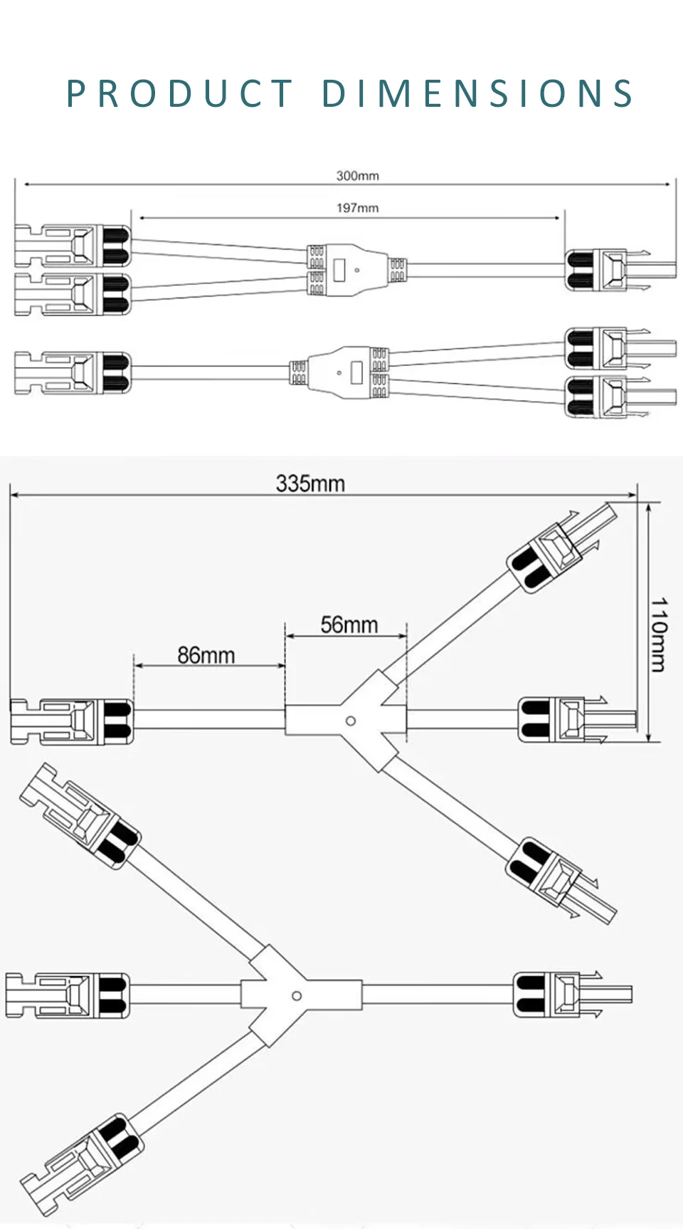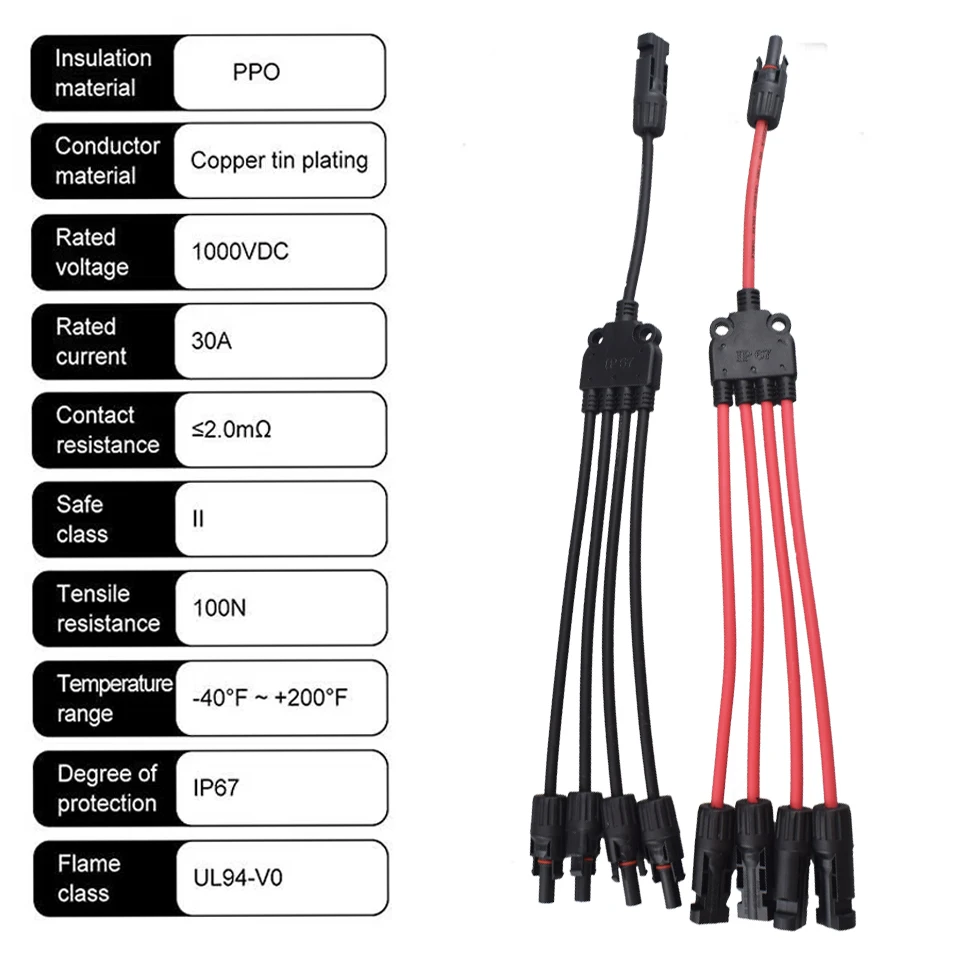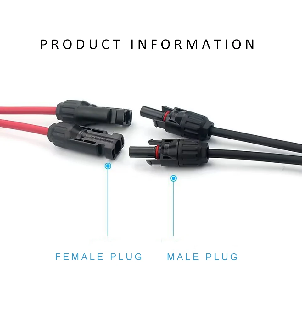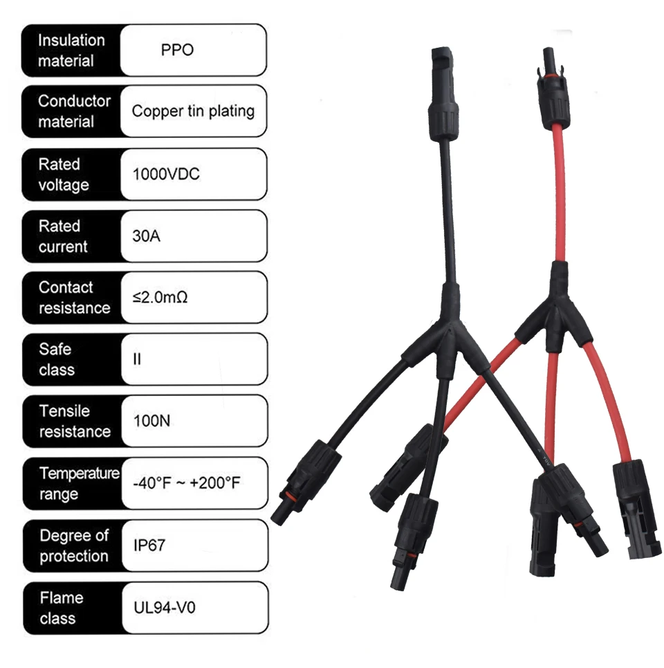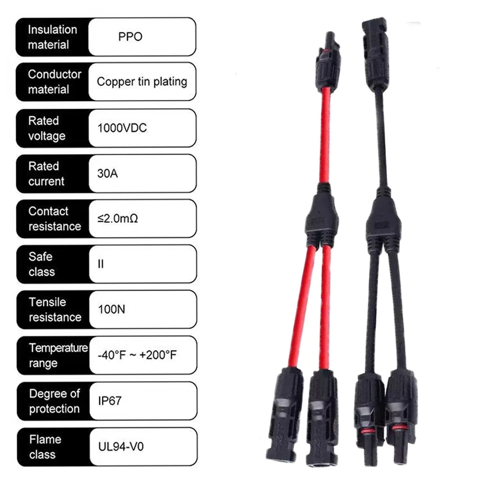 • 【Y Branch Parallel Connector】The solar connector has passed CE and TUV certification, 1 Male to 2 Female (M/FF) and 1 Female to 2 Male (F/MM). It can connect 2 solar cells in parallel.